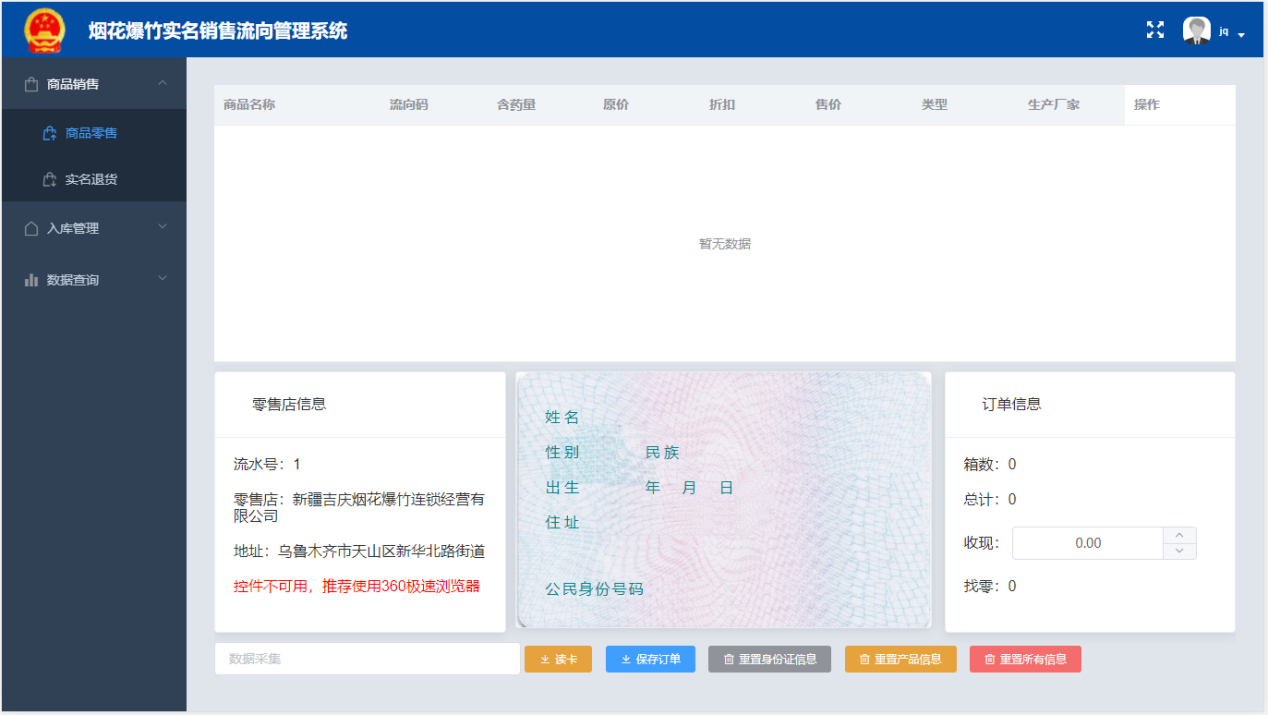 烟花爆竹实名销售流向管理系统,旨在对烟花爆竹销售企业进行智能安全管控,实现实名销售、收银、退货、入库、退库、盘点、统计和分析等功能。该系统具有实时性、准确性、时效性等特点,可有效辅助销售企业对销售流程进行全面智能安全管控,提高管理效率。使用对象为长期零售点或临时零售点。